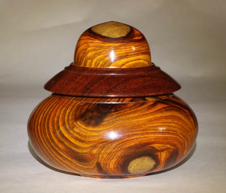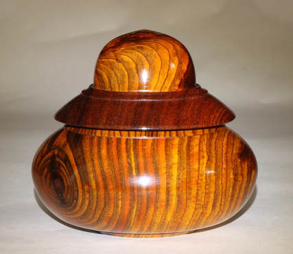 Earlier this month on a trip to Florida I did some wood buying, acquiring among other things some gorgeous coco-bolo (which by now I have to admit is my all time favorite wood). I intended to use the wood in January to prepare for some spring shows, but the appeal of one heavy block of this central american rosewood dragged me out to my shop to begin using it at once. Below are the results, and I've put up this page so that someone who wants to give a special gift could do so by acting immediately. I'm sorry the timing is so close but I couldn't help it. The color and grain of this wood are spectacular, and by the way the darker wood in the lids is also coco-bolo, probably from a different part of Central America. That degree of variation in color is one of the things I really like about this wood. I hope you enjoy seeing it.